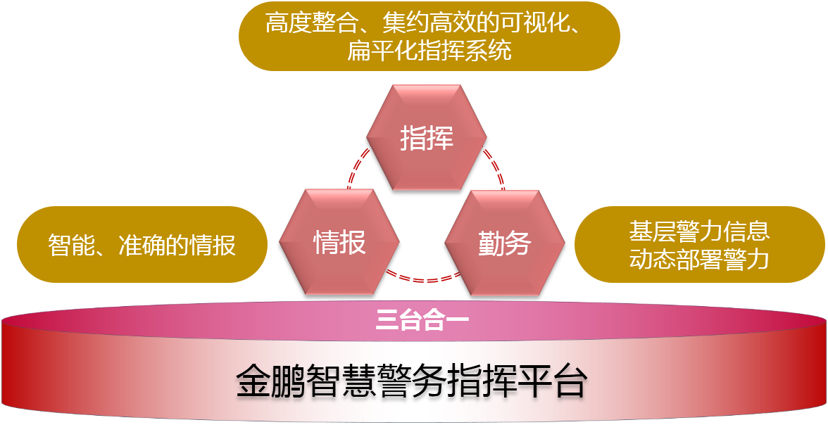 金鵬智慧警務(wù)指揮平臺(tái)以“三臺(tái)合一”指揮調(diào)度體系為軸心,以全局已建成的各類信息化系統(tǒng)為支撐,進(jìn)一步完善系統(tǒng)改造,優(yōu)化運(yùn)行機(jī)制,建立“情報(bào)、指揮、勤務(wù)”一體化工作平臺(tái),向公安指揮體系用戶提供智能化指揮、智能化勤務(wù)、智能化情報(bào)等應(yīng)用。